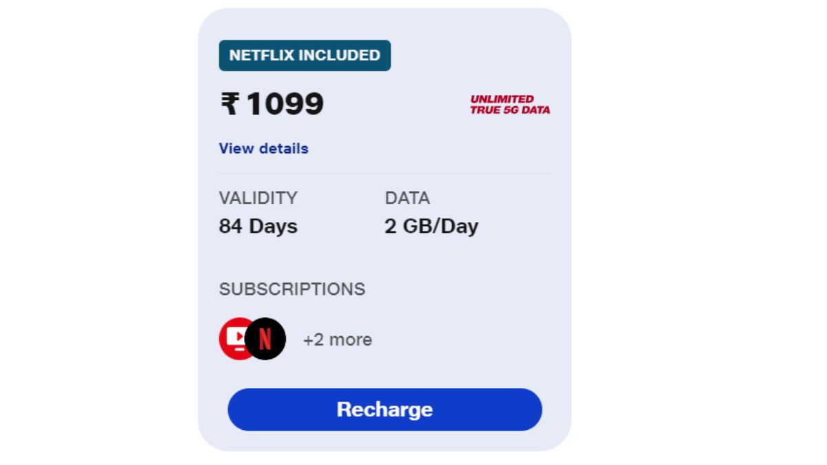 बात करें जियो के नेटफ्लिक्स वाले रिचार्ज प्लान की तो यह दो महीने से ज्यादा की वैलिडिटी के साथ आता है। कीमत की बात करें तो जियो के इस रिचार्ज पैक की कीमत 1099 रुपये पड़ती है। यानी नेटफ्लिक्स के लिए आपको रोजाना 14 रुपये भी खर्च करने की जरूरत नहीं पड़ेगी।