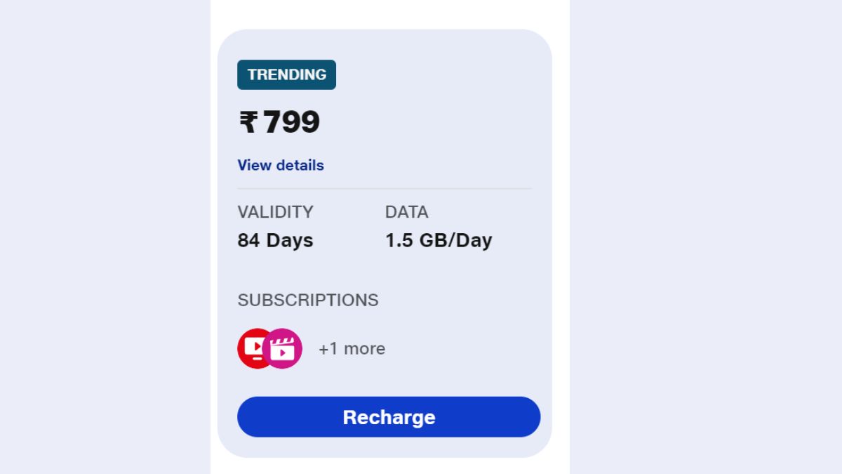 ये रिचार्ज प्लान उन यूजर्स के लिए काम का है जो बार-बार रिचार्ज करवाना पसंद नहीं करते। इस रिचार्ज प्लान के साथ एक मोबाइल फोन यूजर की डेटा, कॉलिंग और एसएमएस की जरूरतें पूरी हो जाती हैं। इस प्लान में यूजर को रोजाना इस्तेमाल के लिए 1.5GB डेटा मिलता है। डेटा का बहुत ज्यादा इस्तेमाल नहीं करते हैं तो ये प्लान आपके लिए बेस्ट रहेगा।