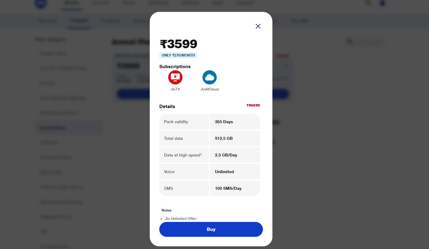 जियो अपने यूजर्स के लिए 3599 रुपये का एक शानदार प्लान ऑफर करता है। इस प्लान में यूजर्स को 276 रुपये के मंथली खर्च पर डेली 2.5GB डेटा और अनलिमिटेड कॉलिंग की सुविधा मिलती है। साथ ही प्लान में रोजाना 100 SMS और 90 दिनों के लिए फ्री JioHotstar Mobile/TV सब्सक्रिप्शन भी मिलता है। यह प्लान उन यूजर्स के लिए बेस्ट है जो हर महीने रिचार्ज से बचना चाहते हैं।