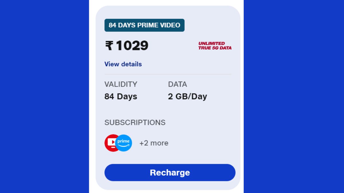 जियो अपने प्रीपेड ग्राहकों को 1029 रुपये में एक बढ़िया मोबाइल रिचार्ज प्लान ऑफर करता है। इस रिचार्ज प्लान की कीमत 1029 रुपये पड़ती है। प्लान के साथ यूजर की कॉलिंग और डेटा की जरूरत पूरी होती है। इसी के साथ यूजर को अमेजन प्राइम वीडियो का सब्सक्रिप्शन भी ऑफर किया जाता है। अच्छी बात ये है कि इतने सारे बेनेफिट्स के साथ इस प्लान की कीमत रोजाना के आधार पर यूजर को 13 रुपये से भी कम पड़ती है।