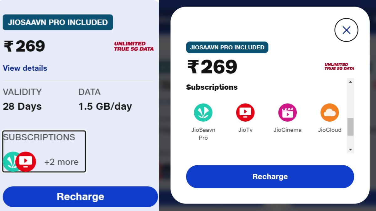 जियो अपने यूजर्स को मोबाइल रिचार्ज प्लान के साथ JioSaavn Pro की सुविधा देता है। यह सुविधा म्यूजिक लवर्स के लिए पेश की जाती है। जियो सावन प्रो सब्सक्रिप्शन 269 रुपये वाले रिचार्ज प्लान के साथ फ्री मिलता है।