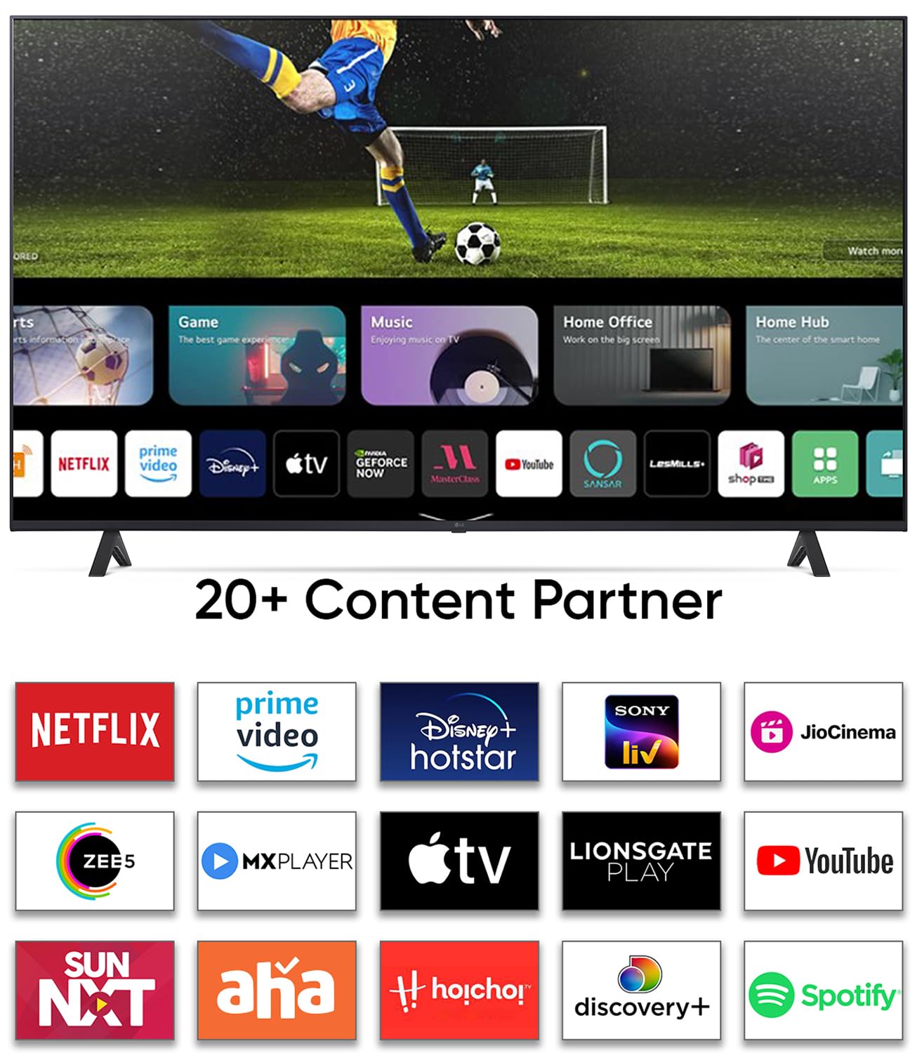 इसके अलावा इस टीवी के साथ आपको नेटफ्लिक्स, प्राइम वीडियो, Zee5, जियो सिनेमा, MX Player, वूट, सोनीलिव, डिस्कवरी+, यूट्यूब, Yuppटीवी, Apple टीवी, डिज्नी+ हॉटस्टार का सपोर्ट मिलता है।