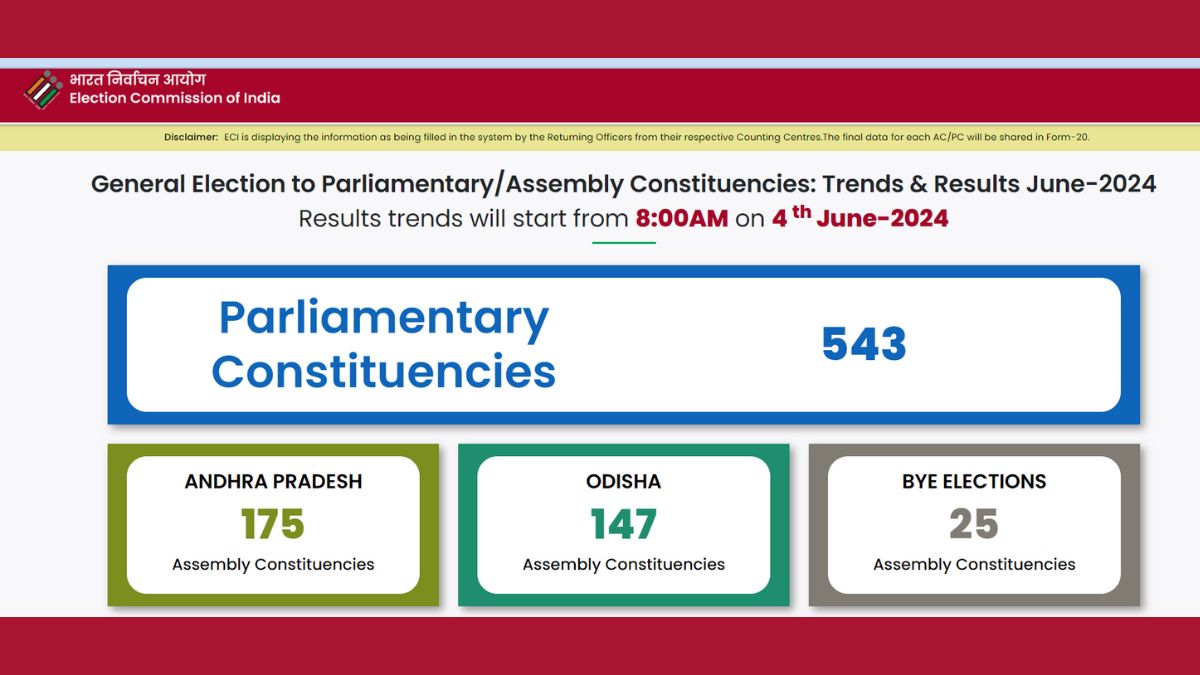 ऑफिशियल वेबसाइट पर दी गई जानकारी के मुताबिक, रिजल्ट ट्रेंड सुबह 8 बजे से शुरू हो जाएगा। इसके अलावा, आंध्रप्रदेश और ओडिशा के विधानसभा चुनाव को लेकर भी अपडेट चेक कर सकते हैं।