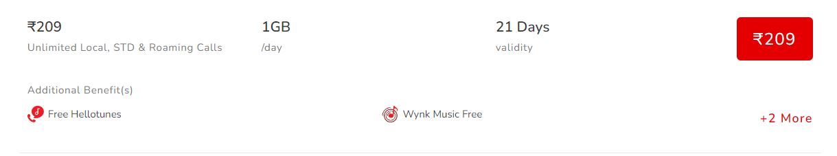 एयरटेल अपने ग्राहकों को 209 रुपये के खर्च पर 1जीबी डेली डेटा ऑफर करता है। इस प्रीपेड रिचार्ज प्लान को कंपनी 21 दिन की वैलिडिटी के साथ ऑफर करती है।