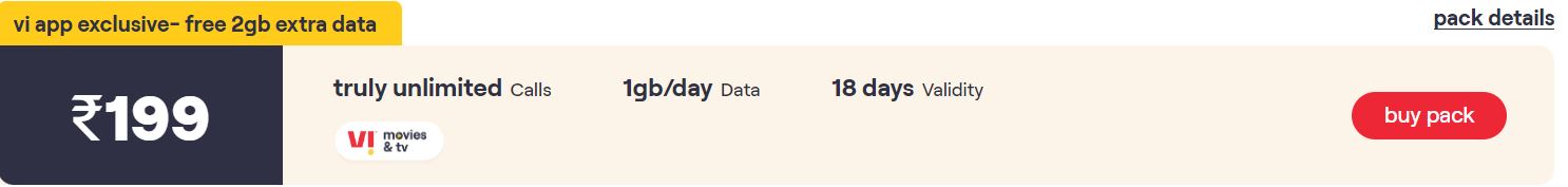 वोडाफोन- आईडिया अपने ग्राहकों को 199 रुपये के खर्च पर 1जीबी डेली डेटा ऑफर करता है। इस प्रीपेड रिचार्ज प्लान को कंपनी 18 दिन की वैलिडिटी के साथ ऑफर करती है।
