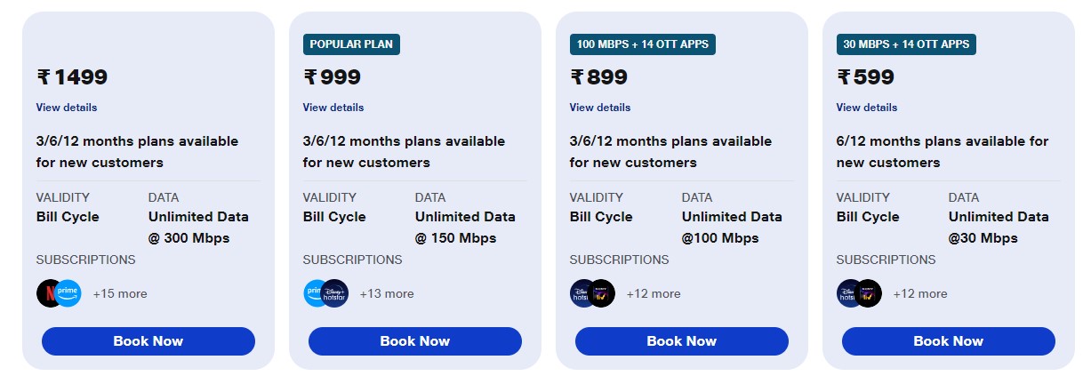 - इस प्लान में 300mbps डाउनलोड स्पीड, अनलिमिटेड वॉयस कॉलिंग और Amazon Prime और Disney+ Hotstar के साथ Netflix (बेसिक) की सुविधा वाला प्रीमियम OTT बंडल मिलता है।