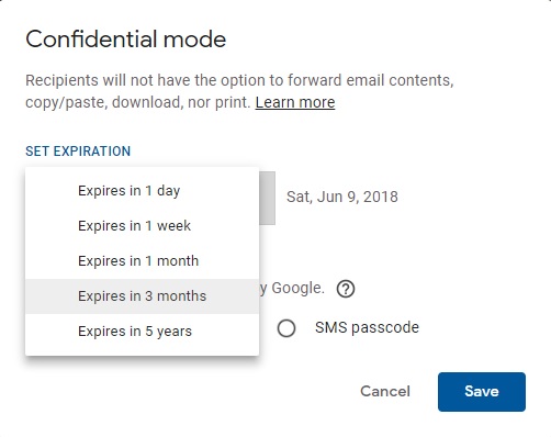 जीमेल के कॉन्फिडैंशल मोड में अब आप अपने ई-मेल के समय को सेट कर सकते हैं। तय किए हुए समय के बाद आपका भेजा हुआ ई-मेल अपने आप डिलीट हो जाएगा। ...और पढ़ें