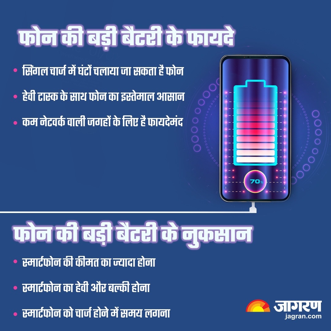 फोन की लंबी बैटरी लाइफ के लिए ही बड़ी बैटरी की जरूरत महसूस होती है, लेकिन क्या आप जानते हैं, फोन में बड़ी बैटरी का फायदा है तो इसका नुकसान भी है। इस आर्टिकल में आपको स्मार्टफोन की बड़ी बैटरी के फायदे के साथ-साथ नुकसान भी बता रहे हैं। एक नया स्मार्टफोन खरीदने जा रहे हैं तो बड़ी बैटरी वाला फोन खरीदना चाहिए या नहीं, इस बारे में भी आपको जानकारी देने की कोशिश करेंगे-