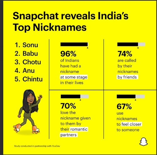 दो निकनेम लेंस भारत में निकनेम की अनूठी उपसंस्कृति पर YouGov के साथ स्नैपचैट के लेटस्ट शोध पर आधारित हैं। अध्ययन में भारत के टॉप निकनेम के साथ-साथ अन्य दिलचस्प जानकारियां भी सामने आईं, जिनमें 96% से अधिक भारतीयों ने अपने जीवन में किसी न किसी समय निकनेम का उपयोग किया है।