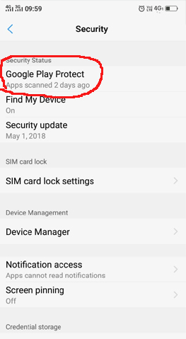 स्टेप-4: स्कियोरिटी पर टैप करते हुए सबसे ऊपर आपको गूगल प्ले प्रोटेक्ट ऑप्शन दिखाई देगा, उसपर टैप करें।