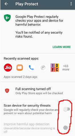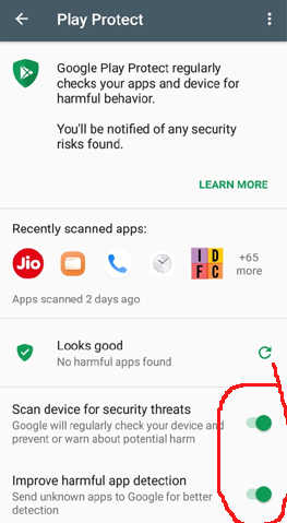 स्टेप-5: यहां आपको स्कैन डिवाइस फॉर सिक्योरिटी थ्रेट्स और इंप्रूव हार्मफुल एप डिटेक्शन ऑप्शन दिखाई देगा।