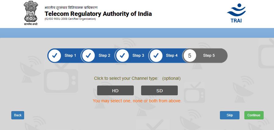 - अंत में आपसे एसडी या एचडी या दोनों की जानकारी मांगी जाएगी। इस समय कुच 550 फ्री-टू-एयर चैनल्स उपलब्ध हैं। इन फ्री-टू-एयर चैनल्स के बाद आपको पे चैनल्स का चुनाव करना होगा।