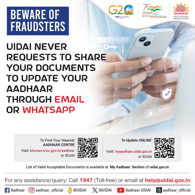 आधार जारी करने वाली संस्था ने एक्स (पूर्व ट्विटर) पर पोस्ट किया कि UIDAI आपसे कभी भी ईमेल या वॉट्सऐप पर अपने #आधार को अपडेट करने के लिए अपने पीओआई/पीओए दस्तावेज साझा करने के लिए नहीं कहता है। अपने आधार को या तो #myAadhaarPortal के माध्यम से ऑनलाइन अपडेट करें या अपने नजदीकी आधार केंद्रों पर जाएं।