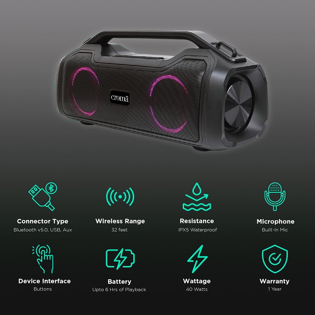 दिन भर काम की थकान मिटाने के लिए म्यूजिक से अच्छा कुछ नहीं हो सकता है। अगर आपके पार्टनर के म्यूजिक लवर हैं तो आप उन्हें एक बढ़िया ब्लूटूथ स्पीकर गिफ्ट कर सकते हैं। इसके लिए Croma Boombox 40W Portable Bluetooth Speaker को ऑर्डर कर सकते हैं। इसकी कीमत 4499 रुपये है।