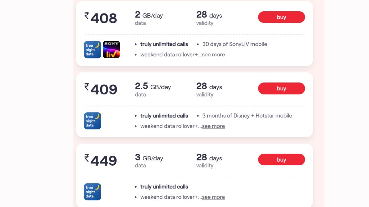 प्लान अनलिमिटेड कॉलिंग और 100 SMS/Day बेनेफिट के साथ 30 दिन का SonyLiv Subscription भी ऑफर करता है। प्लान फ्री नाइट डेटा के साथ आता है।