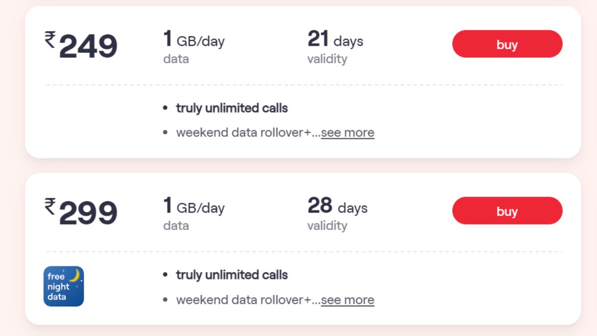 इस प्लान में यूजर्स को 2.5 GB/day डेटा 28 दिन की वैलिडिटी के साथ ऑफर किया जा रहा है। प्लान अनलिमिटेड कॉलिंग और 100 SMS/Day बेनेफिट के साथ आता है।प्लान फ्री नाइट डेटा के साथ आता है।