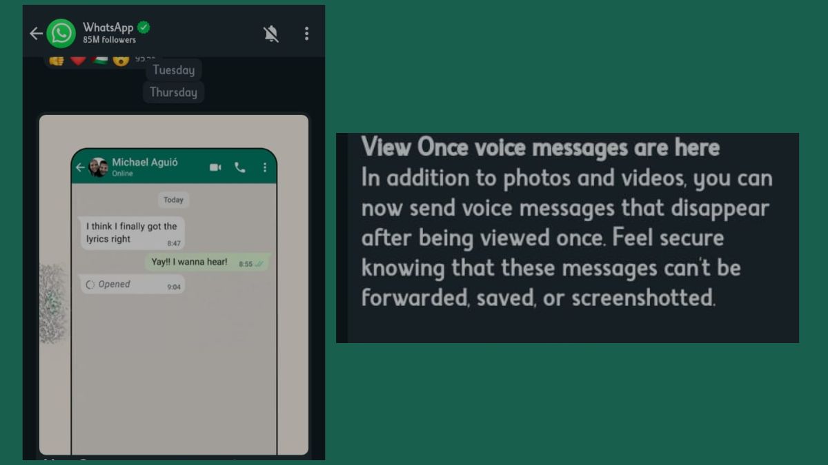 एक बड़े यूजर बेस की अलग-अलग जरूरत को देखते हुए ही वॉट्सऐप पर प्राइवेसी फीचर्स की सुविधा मिलती है। इन्हीं फीचर में से एक व्यू वन्स सेटिंग है। फीचर के साथ पहले फोटो और वीडियो को ही सेंड करने की सुविधा मिलती थी। इस फीचर का इस्तेमाल अब वॉइस मैसेज के लिए भी किया जा सकता है। मैसेज सेंड होने के बाद यह केवल एक ही बार ओपन होता है।