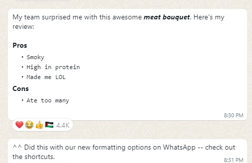 बुलेटेड लिस्ट: यूजर्स अब डैश सिंबल (-) के बाद एक स्पेस और फिर अपना मैसेज टाइप करके बुलेटेड लिस्टिंग बना सकते हैं।