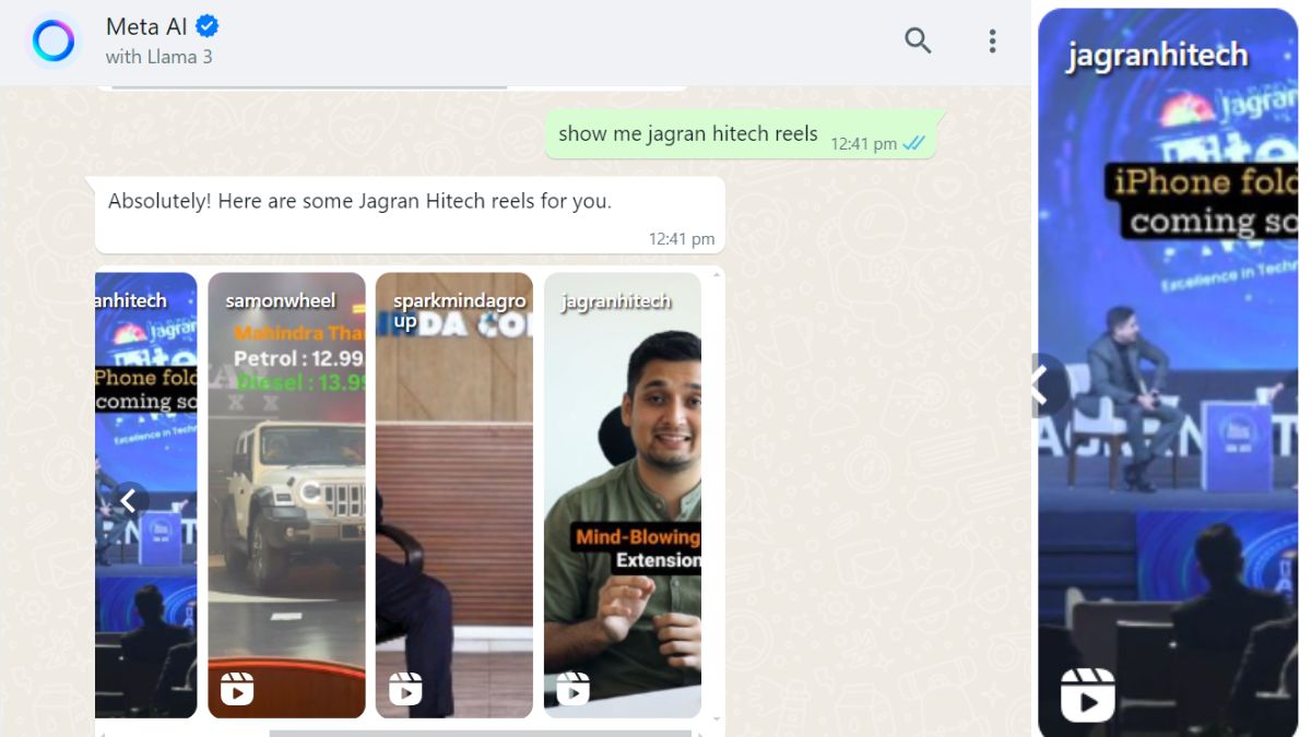 वॉट्सऐप पर रील देखने के लिए मेटा एआई में सिर्फ एक प्रॉम्प्ट दर्ज करना होता है। जिस भी इंफ्लूएंसर की आप रील देखना चाहते हैं उसके लिए आपको कुछ इस तरह Show me jagran hitech reels लिखना होता है। इतना करने के बाद आपके सामने संबधित रील्स आ जाती हैं। जब रील पर क्लिक करेंगे तो आपको इंस्टाग्राम पर ही भेज दिया जाता है।