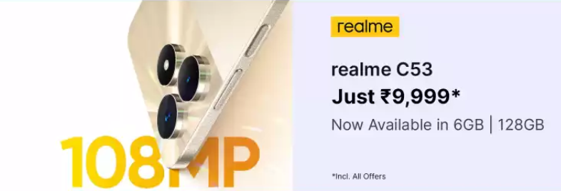 Realme C53 फोन को पिछले महीने इंडिया में लॉन्च किया गया था। कीमत की बात करें तो 6GB रैम और 64GB स्टोरेज की कीमत 10,999 रुपये है। फ्लिपकार्ट पर इस फोन को 10,999 में लिस्ट किया गया है। फ्लिपकार्ट सेल प्रीमियम यूजर्स के लिए आज से शुरू है। सेल में ये फोन सिर्फ 9999 में मिलेगा। HDFC Bank Credit कार्ड या Debit Card है तो आप इस फोन पर 1 हजार का डिस्काउंट भी मिलेगा।