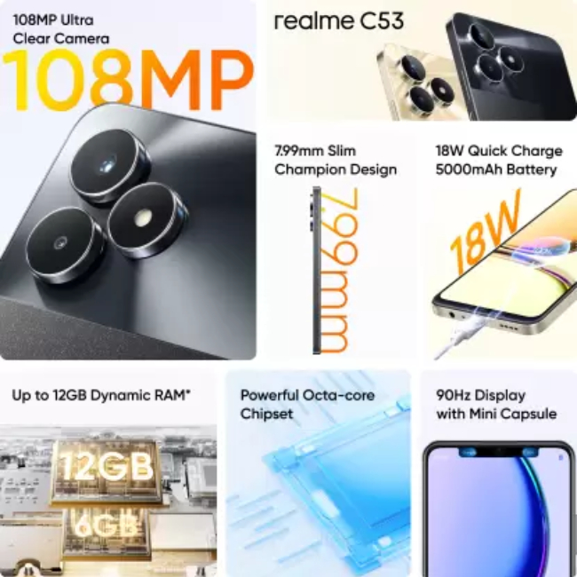 - Realme C53 स्मार्टफोन को 4GB और 6GB रैम ऑप्शन के साथ तीन वेरिएंट में पेश किया गया है।