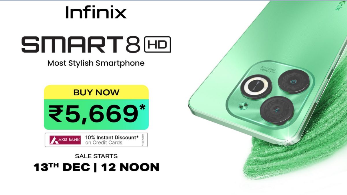 Infinix Smart 8 HD की खरीदारी आज यानी 13 दिसंबर, दोपहर 12 बजे से फ्लिपकार्ट से की जा सकेगी। बता दें, इस फोन को 6299 रुपये में लॉन्च किया गया है। हालांकि, पहली सेल में फोन को स्पेशल लॉन्च प्राइस 5669 रुपये में खरीद सकते हैं। कंपनी ग्राहकों को Axis Debit और Credit Card पर 10 प्रतिशत का इंस्टेंट डिस्काउंट ऑफर कर रही है।