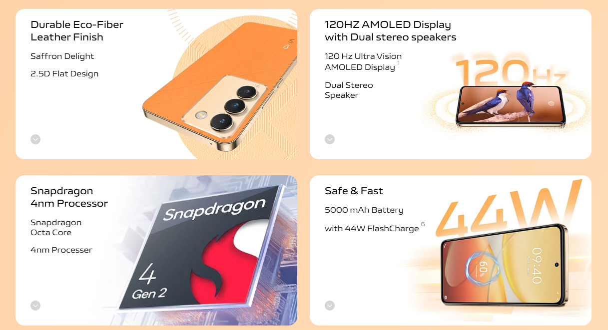बैटरी: इस फोन में 5000mAh की बैटरी के साथ 44W फास्ट चार्जिंग का सपोर्ट दिया गया है। इसके साथ ही यह फोन एंड्रॉइड 14 पर आधारित वीवो के कस्टम यूजर इंटरफेस पर रन करता है। फोन में डुअल सिम 5G और 4G, वाई-फाई और ब्लूटूथ 5.0 का सपोर्ट मिलता है।