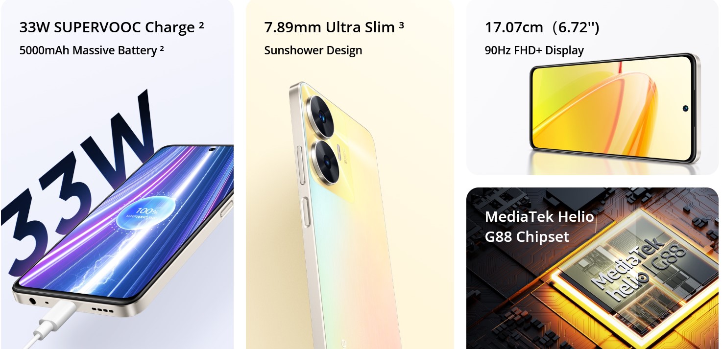 Realme C55 का बेस वेरिएंट 4जीबी रैम और 64 जीबी इंटरनल स्टोरेज के साथ आता है। रियलमी ने नए फोन के बैक पैनल को सनशॉवर फिनिश दिया है और यह प्लास्टिक बॉडी है।