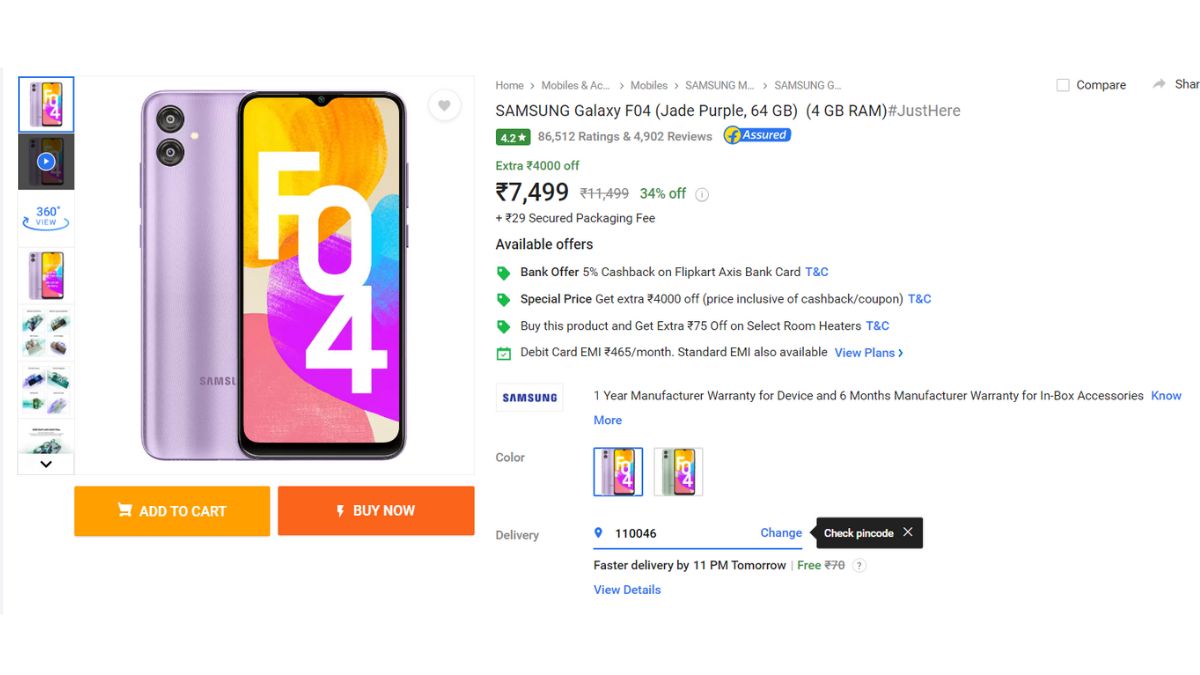 दरअसल, हम यहां Samsung Galaxy F04 स्मार्टफोन की बात कर रहे हैं। इस फोन की एमआरपी 11499 रुपये पड़ती है। हालांकि, इस फोन को फ्लिपकार्ट पर 7499 रुपये पर लिस्ट किया गया है।