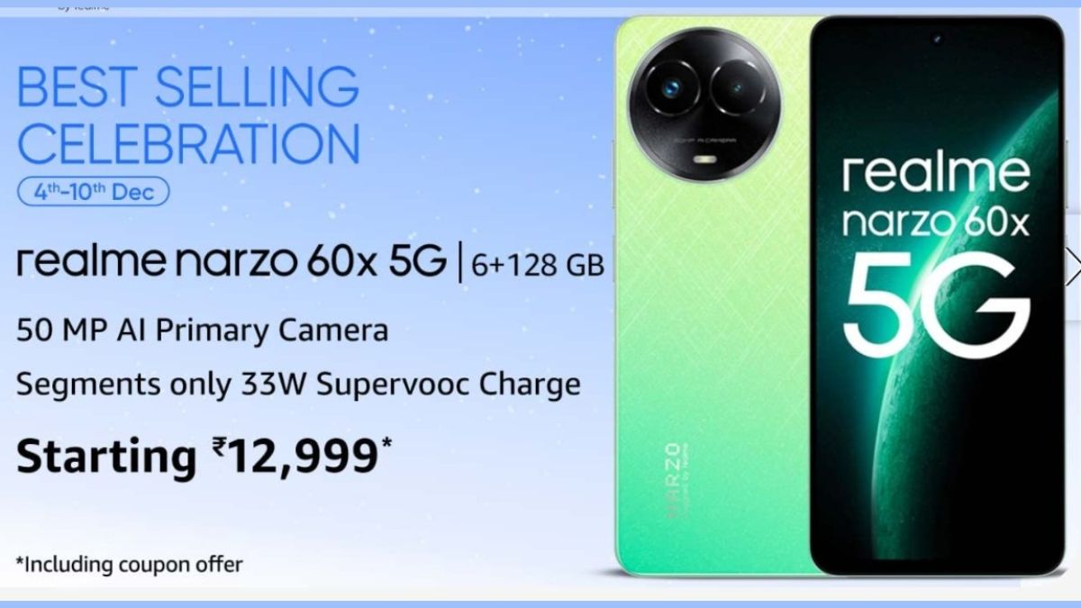 narzo 60x 5G स्मार्टफोन को कम दाम में खरीदने के लिए कुछ ही दिन बाकी रह गए हैं। दरअसल, अमेजन पर बेस्ट सेलिंग सेलिब्रेशन के साथ फोन को 10 दिसंबर तक ही खरीदा जा सकता है। फोन की सेल 4 दिसंबर से शुरू हो चुकी है।
