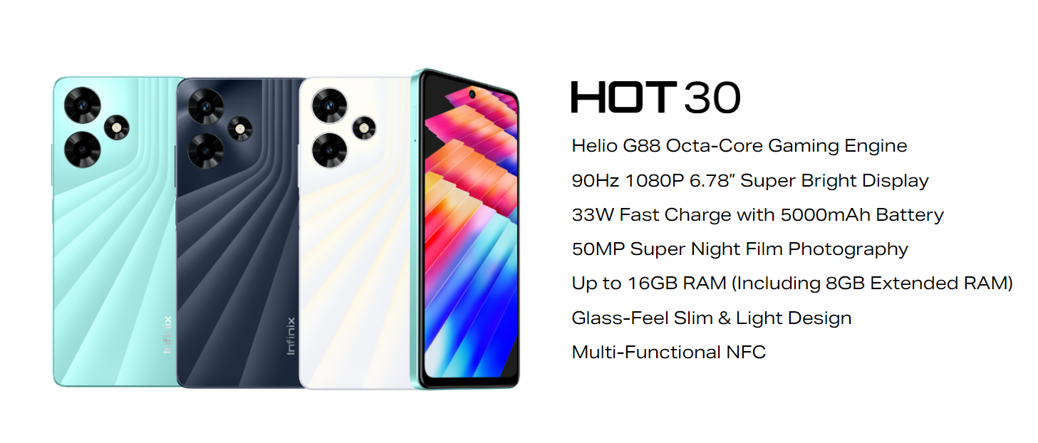 - Hot 30 कंपनी के लेटेस्ट ऑपरेटिंग सॉफ्टवेयर, XOS 13 पर चलता है, जो एंड्रॉइड 13 पर आधारित है।