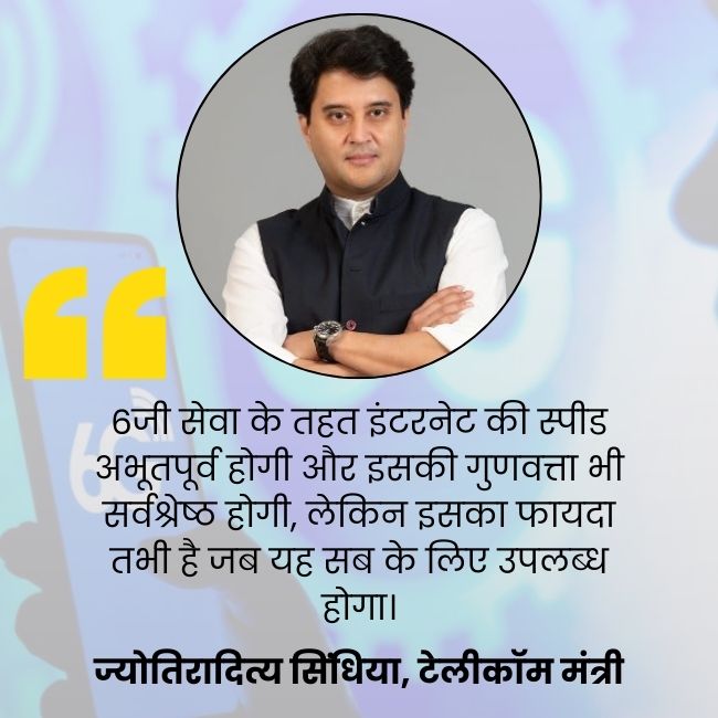 टेलीकॉम मंत्री ज्योतिरादित्य सिंधिया ने कहा कि 6जी सेवा के तहत इंटरनेट की स्पीड अभूतपूर्व होगी और इसकी गुणवत्ता भी सर्वश्रेष्ठ होगी, लेकिन इसका फायदा तभी है जब यह सब के लिए उपलब्ध होगा। उन्होंने कहा कि 6जी सेवा इस्तेमाल करने वालों की साइबर सुरक्षा का भी पुख्ता इंतजाम करना होगा।