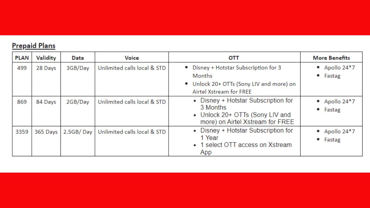 टी20 क्रिकेट टूर्नामेंट के लिए प्रीपेड प्लान 499 रुपये से शुरू होते हैं। 499 रुपये वाला यह प्लान 28 दिन की वैलिडिटी के साथ हाई-स्पीड 3GB डेटा के साथ-साथ डिज्नी+ हॉटस्टार के तीन महीने के सब्सक्रिप्शन के साथ आता है। इस प्लान में एयरटेल एक्सस्ट्रीम प्ले पर 20 से ज्यादा ओटीटी को मुफ्त में अनलॉक किया जा सकेगा।