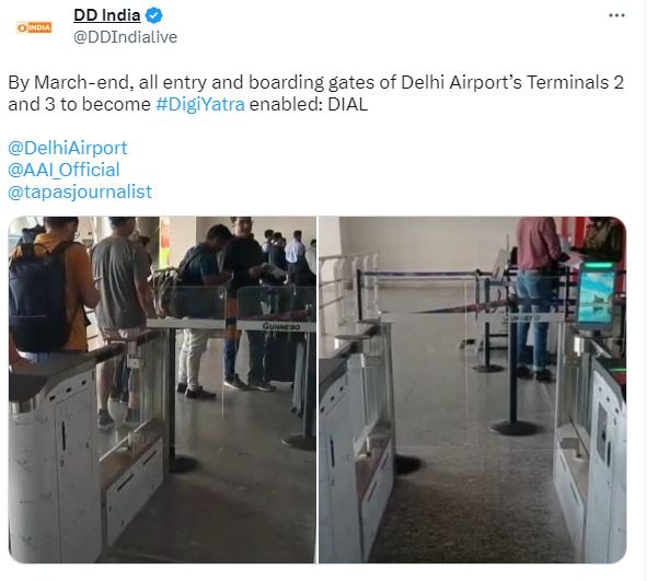 फिलहाल नई रिपोर्ट से पता चला है कि दिल्ली के दो टर्मिनल यानी टर्मिनल 2 और 3 के सभी एंट्री और बोर्डिंग गेट Digi Yatra इनेबल होंगे। बता दें कि ये बदलाव मार्च के आखिर तक लागू हो जाएगा। दूरदर्शन ने अपने ट्विटर पोस्ट पर इसकी जानकारी दी है। हम यहां आपके साथ उस ट्विटर पोस्ट का स्क्रिनशार्ट शेयर कर रहे हैं।