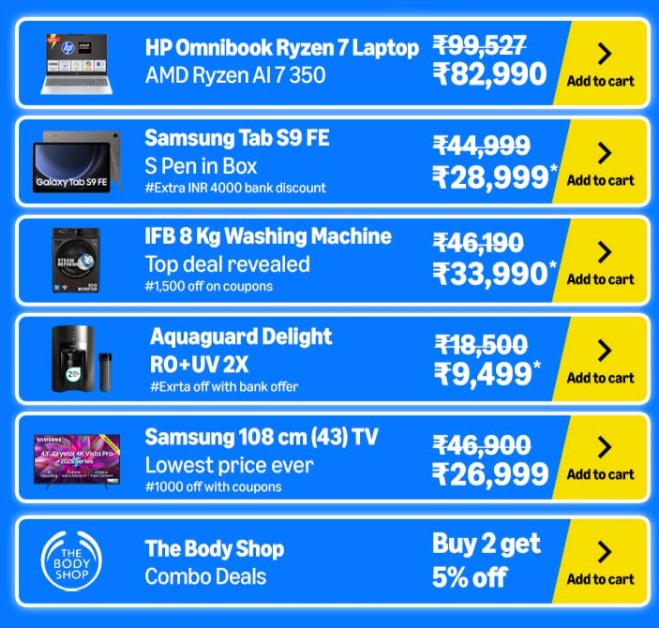 डील को और भी जबरदस्त बनाने के लिए ई कॉमर्स प्लेटफॉर्म एक्स्ट्रा बैंक ऑफर दे सकता है। प्राइम मेंबर्स ICICI बैंक के क्रेडिट और डेबिट कार्ड, SBI क्रेडिट कार्ड या इन बैंक्स के कार्ड पर EMI ऑप्शन के साथ 10 परसेंट तक की छूट ले सकते हैं।