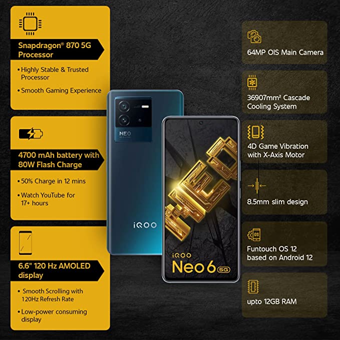 इस फोन को अमेज़न ग्रेट इंडियन फेस्टिवल सेल के दौरान iQoo Neo 6 5G 27,999 रुपये की कीमत पर लिस्ट किया है। इस फोन के लिए आपको SBI कार्ड पर 750 रुपये का ऑफर मिल सकता है।