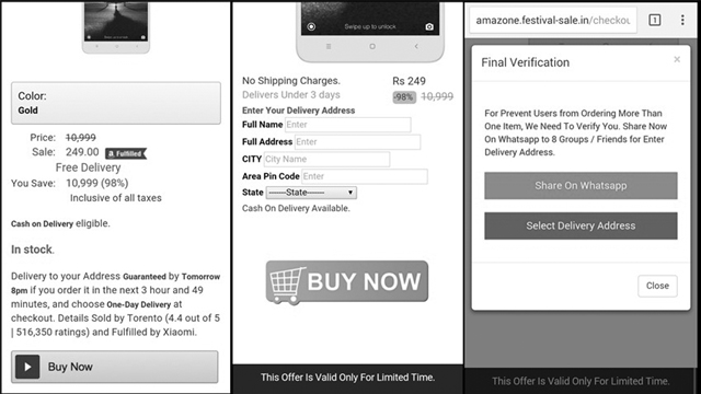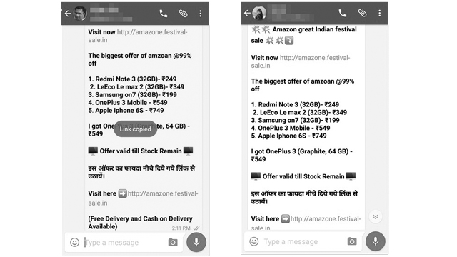 इस मैसेज के मुताबिक, अमेजन ग्रेट इंडियन फेस्टिवल सेल के तहत कई स्मार्टफोन्स पर 99 फीसदी का ऑफ दिया जा राह है। इस लिस्ट में Redmi Note 3 मात्र 249 रुपये, Samsung on7 मात्र 199 रुपये, Apple Iphone 6S मात्र 749 रुपये जैसे कई बड़े स्मार्टफोन्स शामिल हैं। यही नहीं, इस मैसेज में ये भी लिखा है कि इस मैसेज को भेजने वाले को एक OnePlus 3 मात्र 549 रुपये में मिल भी गया है। इस मैसेज में वेबसाइट का लिंक (amazone.festival-sale.in) दिया गया है। इस लिंक के जरिए आप सीधा उस पेज पर पहुंच जाएंगे जहां ऑफर दिया गया है। यहां स्मार्टफोन उसी कीमत में उपलब्ध हैं जो मैसेज में दिए गए हैं।