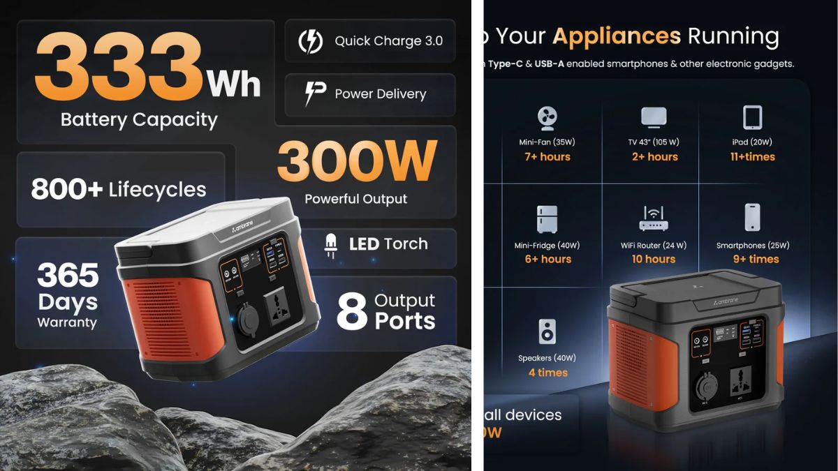 इसमें 300W आउटपुट, LED/SOS टॉर्च और 8 शक्तिशाली आउटपुट है, यह पोर्टेबल चार्जिंग में एक पावरहाउस है, जो विश्वसनीयता के लिए 800+ से अधिक लाइफसाइकिल्स का दावा करता है।