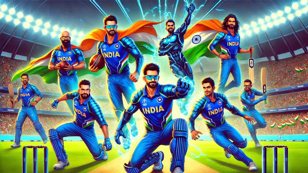 Please make me a graphic image showing the Indian Cricket team as Superheroes.