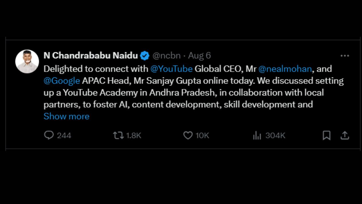 आंध्रप्रदेश के मुख्यमंत्री एन चंद्रबाबू नायडू ने अपने ऑफिशियल एक्स हैंडल से यूट्यूब को लेकर यह जानकारी दी है। आंध्रप्रदेश के मुख्यमंत्री एन चंद्रबाबू नायडू ने अपने एक्स पोस्ट पर लिखा है कि आज यूट्यूब के ग्लोबल सीईओ नील मोहन और गूगल एशिया प्रशांत क्षेत्र के हेड संजय गुप्ता से ऑनलाइन जुड़कर बहुत खुशी हुई।