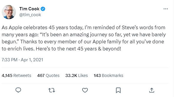Apple के सीइओ Tim Cook ने 1 अप्रैल 2023 को अपने ट्विटर पोस्ट किया और लिखा कि भले ही आज (1अप्रैल) Apple 45 साल पूरे कर रहा है, मुझे कई साल पहले स्टीव के शब्द याद आ रहे हैं कि अब तक की यात्रा अद्भुत रही है, लेकिन अभी हमने बस शुरुआत की है।
