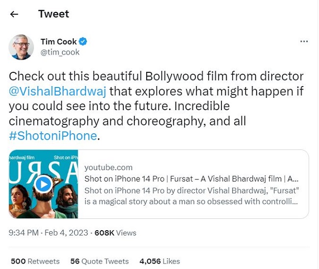 टिम कुक ने अपने ऑफिशियल ट्विटर हैंडल से बॉलीवुड की शॉर्ट फिल्म फुर्सत की तारीफ की है। टिम कुक ने लिखा है, "Check out this beautiful Bollywood film from director @VishalBhardwaj that explores what might happen if you could see into the future. Incredible cinematography and choreography, and all #ShotoniPhone"