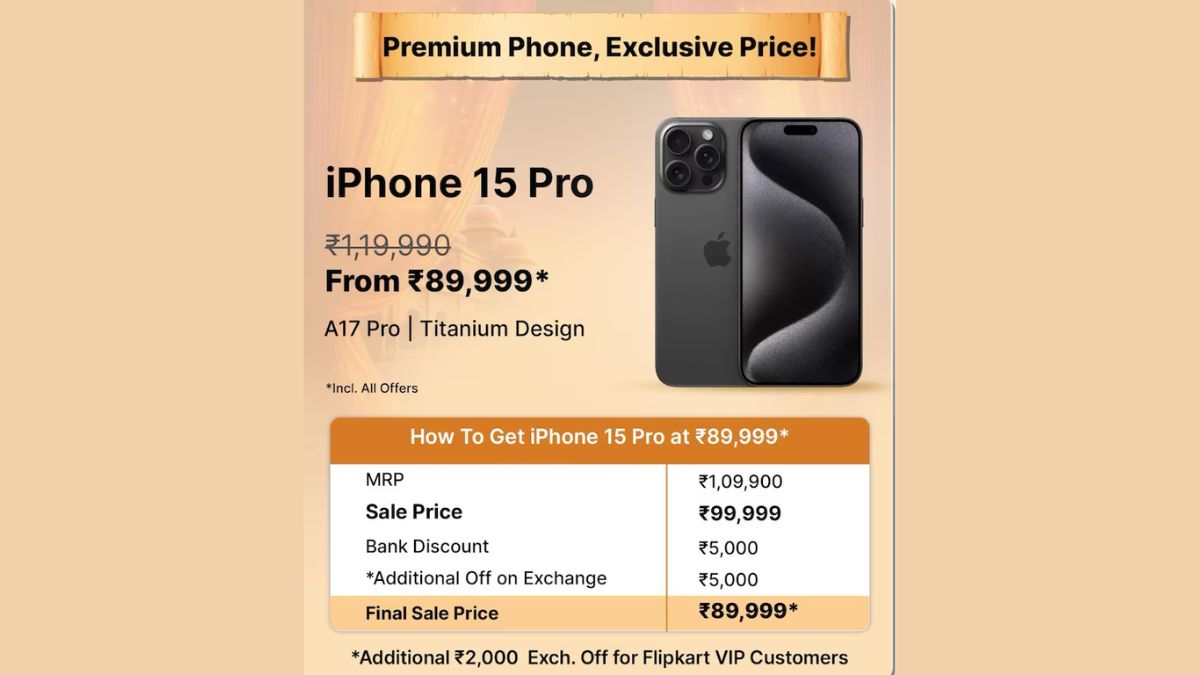 iPhone 15 Pro की बात करें तो हाल ही में फ्लिपकार्ट पर इस मॉडल का सेल प्राइस रिवील हुआ है। फ्लिपकार्ट से iPhone 15 Pro को आप 89,999 रुपये में खरीद सकेंगे। इस फोन को अभी 1,09,900 रुपये पर दिखाया जा रहा है। 10 हजार रुपये के डिसकाउंट के बाद इस फोन की कीमत 99,999 रुपये हो जाएगी। जो कि सभी यूजर्स के लिए दिया जाने वाला डिस्काउंट होगा। इसके बाद बाकी की बचत बैंक और एक्सचेंज ऑफर के साथ की जा सकेगी। Flipkart VIP customers को 2,000 रुपये का एडिशनल एक्सचेंज ऑफ भी दिया जाएगा।