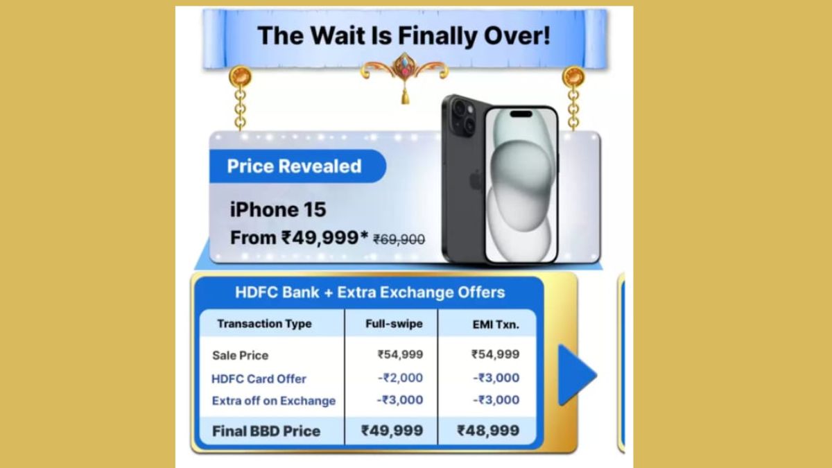 एक लंबे इंतजार के बाद आखिरकार फ्लिपकार्ट पर बिग बिलियन डेज सेल लाइव हो चुकी है। सेल बीती रात 12 बजे से प्लस और वीआईपी मेंबर्स के लिए लाइव हो चुकी है। इसी के साथ सभी यूजर्स के लिए iPhone 15 का सेल प्राइस भी रिवील हो चुका है। जी हां फ्लिपकार्ट सेल में ग्राहकों को iPhone 15 बहुत कम दाम में खरीदने का मौका मिल रहा है।