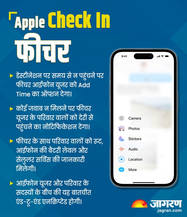 नई आईफोन सीरीज के साथ यूजर्स को चेक-इन फीचर की सुविधा मिल सकती है। इस चेक इन फीचर के साथ आईफोन यूजर किसी जगह सुरक्षित पहुंचने की जानकारी अपनों को पहुंचा सकेंगे।