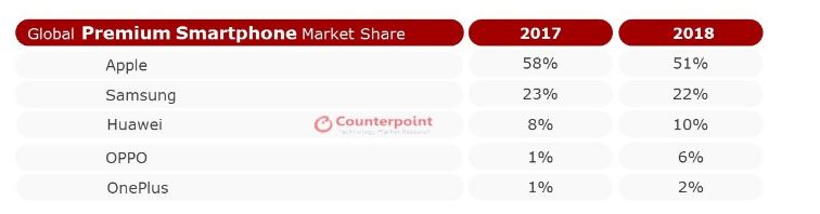 प्रीमियम सेग्मेंट में 40 ऑरिजिनल इक्विपमेंट मैन्युफैकचर्रस (OEM) की एंट्री के साथ ही कम्पीटिशन काफी बढ़ गया है। इस सेग्मेंट के टॉप-5 प्लेयर्स का कुल ग्लोबल बाजार में 90 फीसद हिस्सेदारी है। ओवरऑल बाजार की बात करें तो प्रीमियम सेग्मेंट की ग्लोबल बाजार में 22 फीसद की हिस्सेदारी है। Huawei के P20 और Mate 20 सीरीज की सफलता की वजह से यह प्रीमियम सेगमेंट में तेजी से उभरता हुआ ब्रांड बन चुका है। OPPO के R15 और R17 ने चीनी बाजार में अच्छा बिजनेस किया है जिसकी वजह से कंपनी ने प्रीमियम सेग्मेंट में जोरदार ग्रोथ हासिल किया है। इसके अलावा कंपनी ने हाल ही में 10x Zoom फीचर वाला नया फ्लैगशिप भी पेश किया है। OnePlus 6T की चीन और भारत में जबरदस्त बिक्री की वजह से ग्लोबल तौर पर कंपनी ने प्रीमियम सेग्मेंट के टॉप-5 ब्रांड में पहली बार एंट्री मारी है।