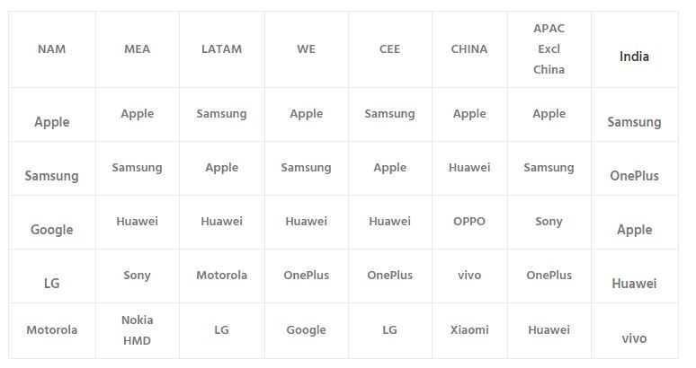 भारतीय बाजार की बात करें तो प्रीमियम सेग्मेंट में कोरियाई कंपनी Samsung ने टॉप स्थान हासिल किया है। वहीं, प्रीमियम सेग्मेंट में OnePlus नंबर-2 पर पहुंच गई है। पिछले साल Apple की सेल गिरी है उसके बावजूद प्रीमियम सेग्मेंट में Apple ने तीसरा स्थान भारतीय बाजार में हासिल किया है। Apple के अलावा Huawei ने भारतीय बाजार के प्रीमियम सेगमेंट में चौथा स्थान हासिल किया है। Vivo ने प्रीमियम सेगमेंट में पांचवां स्थान हासिल किया है।