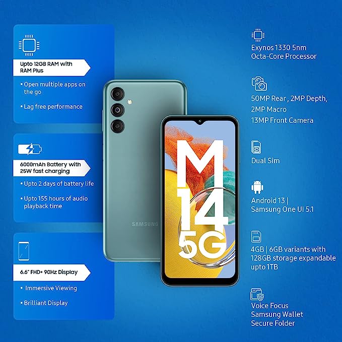 इसमें Exynos 1330 प्रोसेसर, डिवाइस बैटरी परफॉर्मेंस और विश्वसनीय प्रोसेसिंग पावर के बीच सही संतुलन बनाता है। गैलेक्सी M14 5G 15,000 रुपये से कम कीमत में अपने कैमरा प्रदर्शन से प्रभावित करता है। सैमसंग गैलेक्सी M14 5G एक बेहतर फोन है, जो यूजर्स को बेहतर अनुभव देता है।