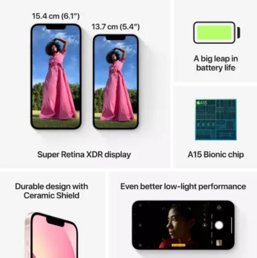 iPhone 13 में आपको 6.1 इंच का Super Retina XDR डिस्प्ले मिलता है। स्टोरेज की बात करें तो यह फोन 128 GB, 256 GB और 512 GB की इंटरनल स्टोरेज के साथ आता है। इसमें आपको A 15 चिप की सुविधा मिलती है, जो 16 कोर न्युरल इंजन के साथ आता है।