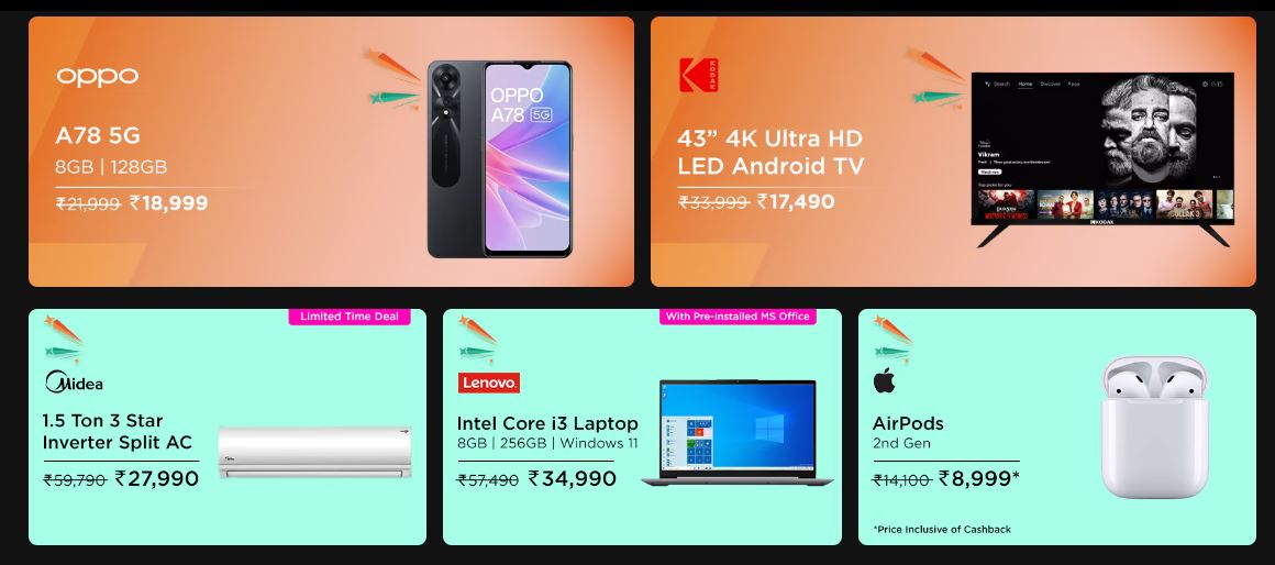 इस सेल में छात्रों और शिक्षकों को लैपटॉप पर फ्लैट 10% मिलता है। इसके साथ ही सैमसंग नियो QLED टीवी 1,990 रुपये प्रति माह की EMI पर खरीदें जा सकते हैं। इसके अलावा वोल्टास का फोर-इन-वन इन्वर्टर स्प्लिट एयर कंडीशनर केवल 2,999 रुपये प्रति माह में उपलब्ध है। इस सेल में Core i3 लैपटॉप की कीमत 33,990 रुपये से शुरू होती है, जबकि Intel के गेमिंग लैपटॉप की कीमत 54,990 रुपये से शुरू होती है।